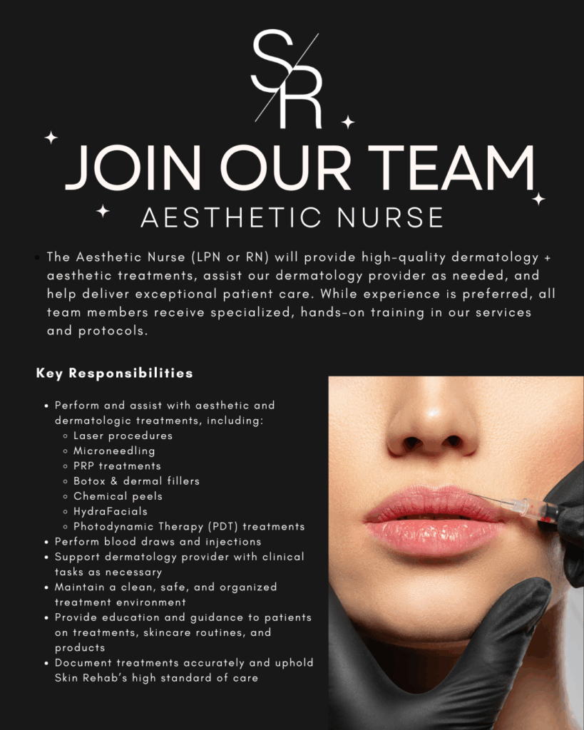 Skin Rehab is growing, and we’re looking for a skilled, motivated, and patient-focused Aesthetic Nurse to join our team! This role is perfect for someone who loves skincare, enjoys building relationships with clients, and wants to work in a fun, supportive, and professional environment.