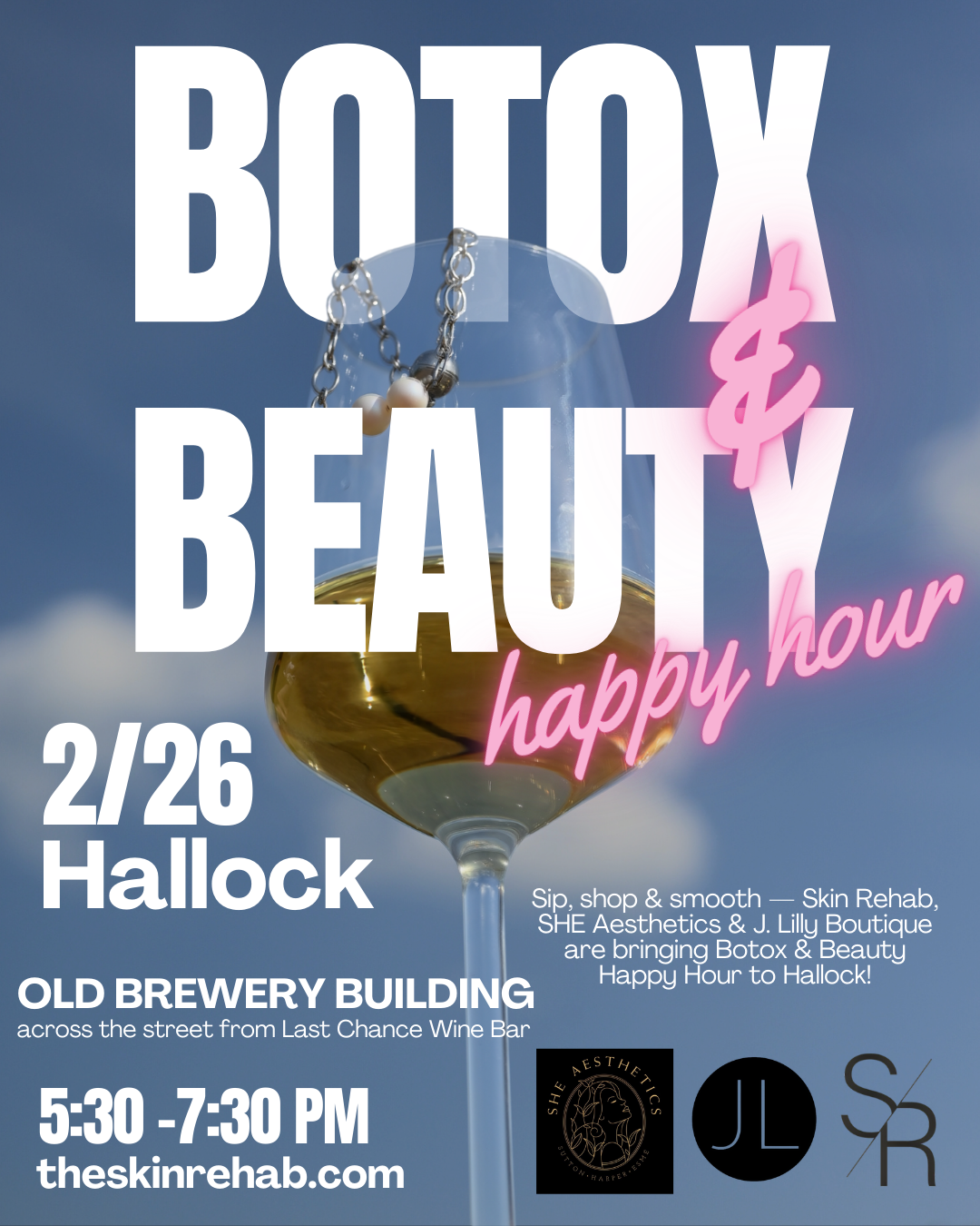 Join us for a fun, relaxed evening of beauty, education, and a little happy hour glow. Skin Rehab, SHE Aesthetics, and J. Lily Boutique are teaming up for a girls’ night out focused on feeling confident, refreshed, and informed. Sip, shop, learn, and connect — all in one place.